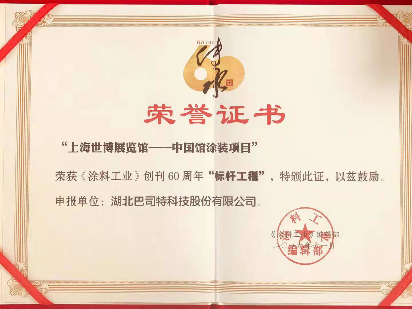 湖北巴司特科技股份有限公司憑借上海世博展覽館——中國(guó)館涂裝項(xiàng)目獲得“標(biāo)桿工程”