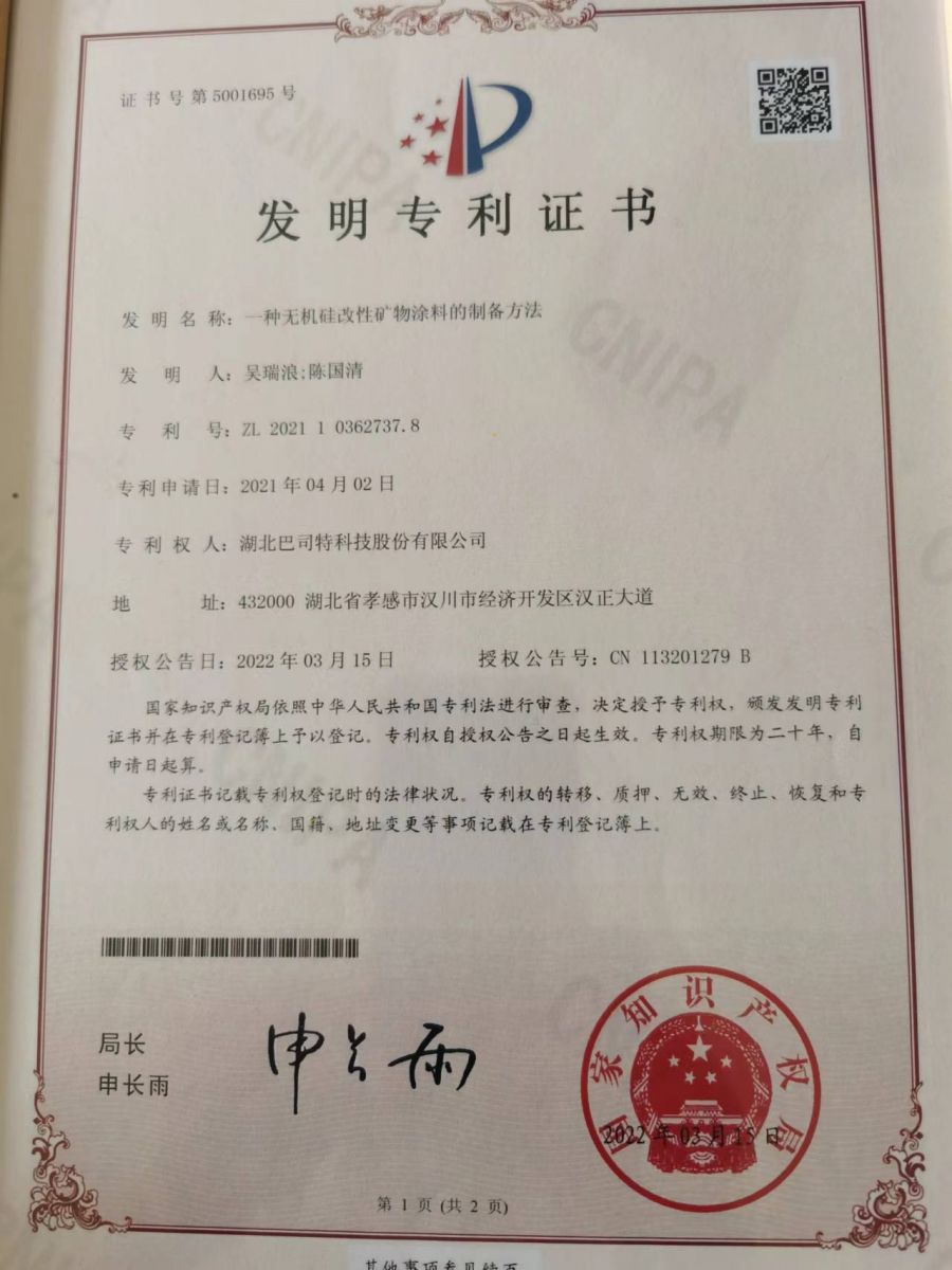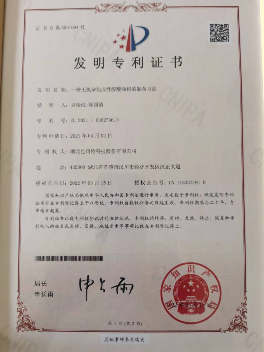 熱烈祝賀湖北巴司特科技股份有限公司于2022年新獲《一種環(huán)保型水性無機(jī)硅改性樹脂涂料的制備方法》、《一種無機(jī)硅改性礦物涂料的制備方法》、《一種無機(jī)雜化改性醇酸涂料的制備方法》、《一種環(huán)保型水性冷噴鋅涂料加工用的低噪聲反應(yīng)釜》、《一種無機(jī)雜化改性丙烯酸涂料的制備方法》5項(xiàng)發(fā)明專利證書。